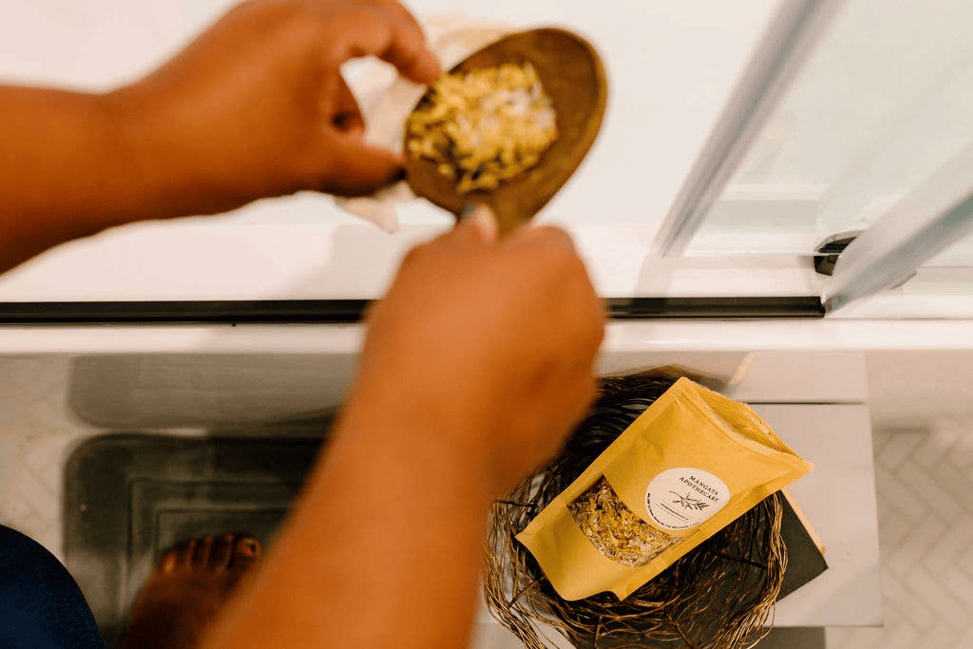 1) Fill supplied cloth bag with 1/3 c. of herb/salts.