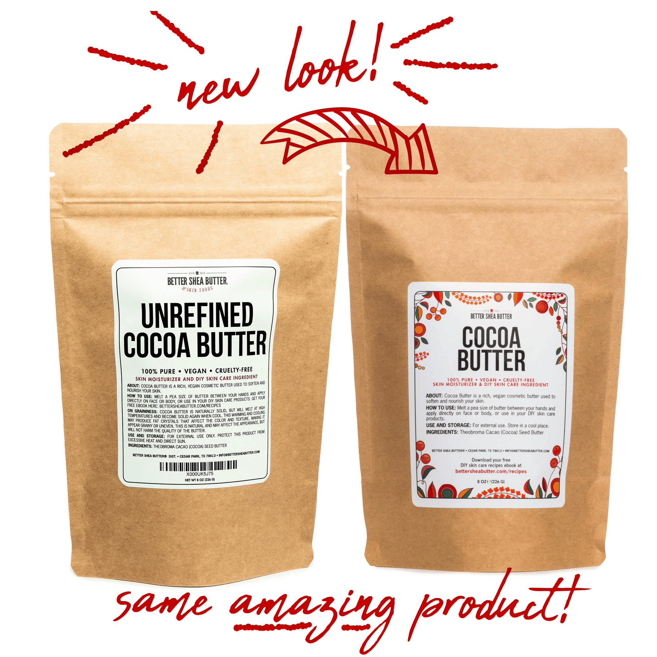 Cocoa Butter is a solid butter rich in antioxidants, vitamins and fatty acids that deeply penetrate the layers of skin to moisturize, improve elasticity and protect it. Its properties make it effective in smoothing or diminishing scars, wrinkles, and similar marks on the skin. It can also help in preventing and minimizing the appearance of stretch marks. Cocoa Butter melts at skin temperature so can be used on its own as a moisturizer though it is particularly popular as an ingredient in making skin care products such as whipped body butters, balms, creams, lotion bars and more. It is a vegan butter. Cocoa butter, also called Theobroma oil, is a pale-yellow or light brown solid fat extracted from the cocoa bean. Cocoa beans are removed from the large cacao plant. They are then roasted, stripped, and pressed to separate out the fat, known as cocoa butter. It has a rich chocolatey smell naturally. Packaging may vary slightly as shown in picture.