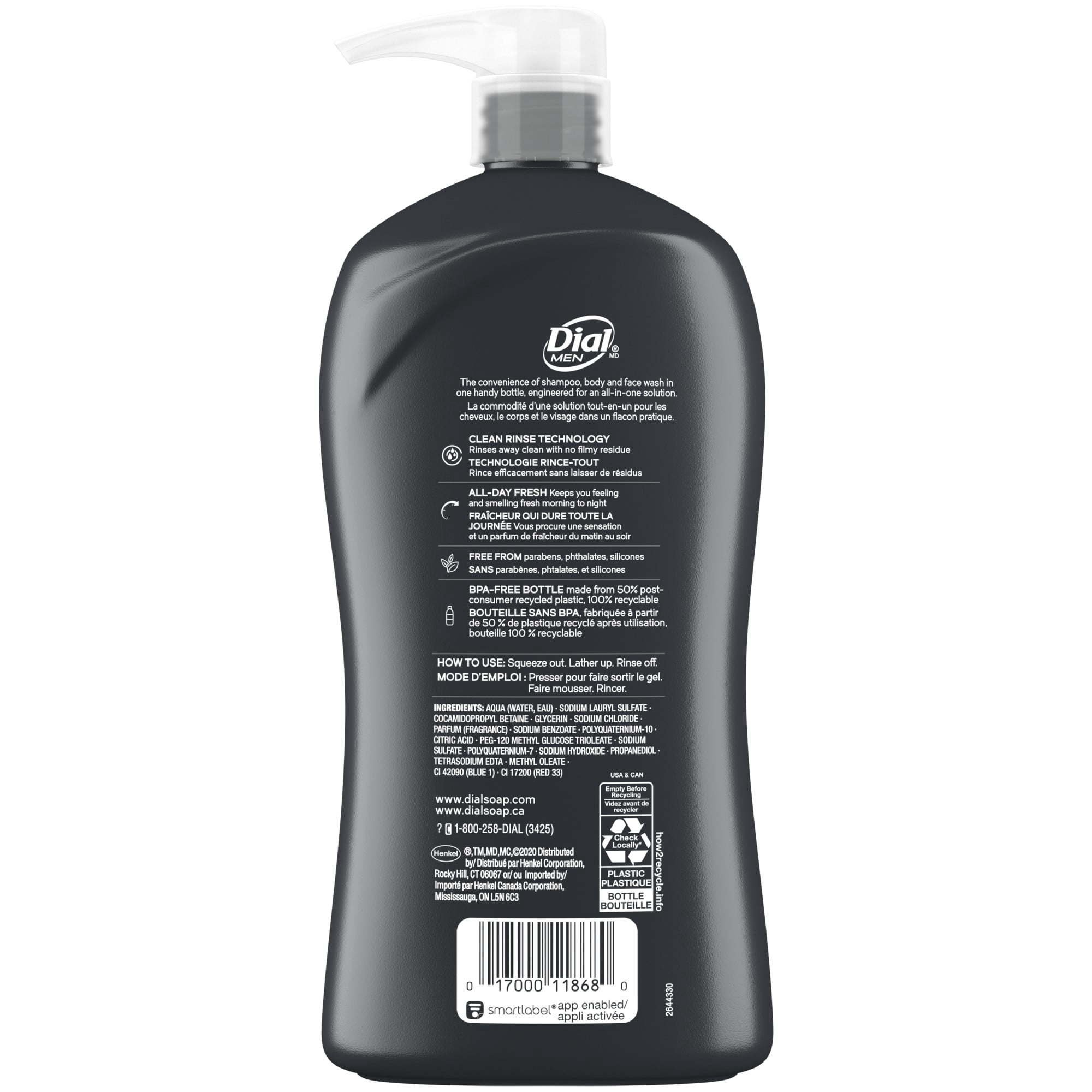 Start your day with the no-nonsense clean of Dial Men Ultimate Clean 3in1 Body, Hair and Face Wash. The convenience of shampoo, body and face wash in one handy bottle, engineered for an all-in-one solution. With its clean rinse technology and rich, creamy lather, you know you’ll be all-day fresh. Dial Men Skin Smart formulas are made to be free from parabens, phthalates and silicones, leaving skin looking and feeling hydrated and healthy. With a recyclable bottle* you can feel good about, and a fresh water scent that will leave you feeling fresh all day. Formulated with Clean Rinse Technology for a clean shower feel that rinses away clean without a filmy residue. (*excludes pump)