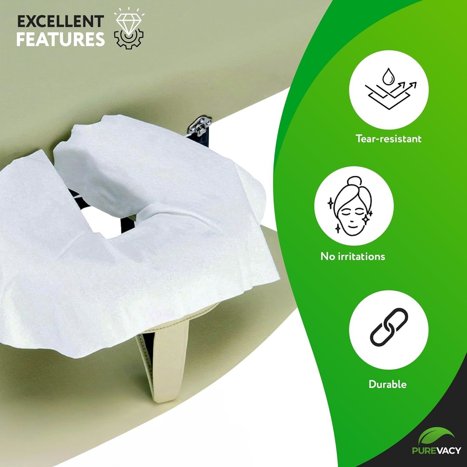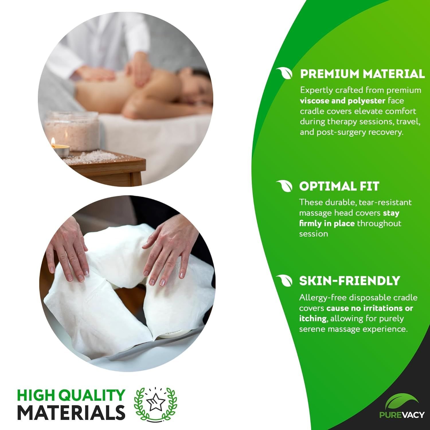 Time for a relaxing massage!Procedures in the massage room must be carried out cleanly and safely.Especially for this, we have created disposable covers designed separately for each client. Shape massage disposable headrest coversto match the parameters of the massage table element.Disposable consumables greatly simplify life not only for visitors but also for massage parlor employees.Massage disposable headrest covers made of soft-touch synthetic materials are moisture-resistant, preventing wear and tear on the upholstery of the massage table. The product is firmly held without slipping, thanks to the wide elastic band.You also need to go to the spa!When choosing bed linen for a spa room, you must first think about your customers: they deserve warm, comfortable, and cozy conditions. Massage table cradle covers are a necessary part of the treatment room. There are essential points on which you should choose the best and most pleasant lingerie for your massage room. Your bedding is one of the first impressions for your client other than yourself. Above all, your clients should always see and feel fresh, clean, and comfortable massage disposable headrest covers. It will help your client relax during the procedure and provide a pleasant feeling and comfort.And don't forget to visit the beauty salon!Cleanliness is the visiting card of the master. Clients will want to return to a neat, well-groomed, and clean salon again because such an appearance speaks of its owner's severe approach and caring attitude to his visitors. Clients do not have to worry about which couch they lie on. If the beauty chair is equipped with PUREVACY Disposable Face Cradle Covers, then the procedure will be safe and comfortable, and enjoyable!Suitable forFace CradleFace CradleHeadrestHalf ChairWhole ChairMaterialSoft FabricSoft Fabric 25 GSMClear PolyethyleneClear PolyethyleneClear PolyethyleneFeaturesHypoallergenicHypoallergenicDurableDurableDurable