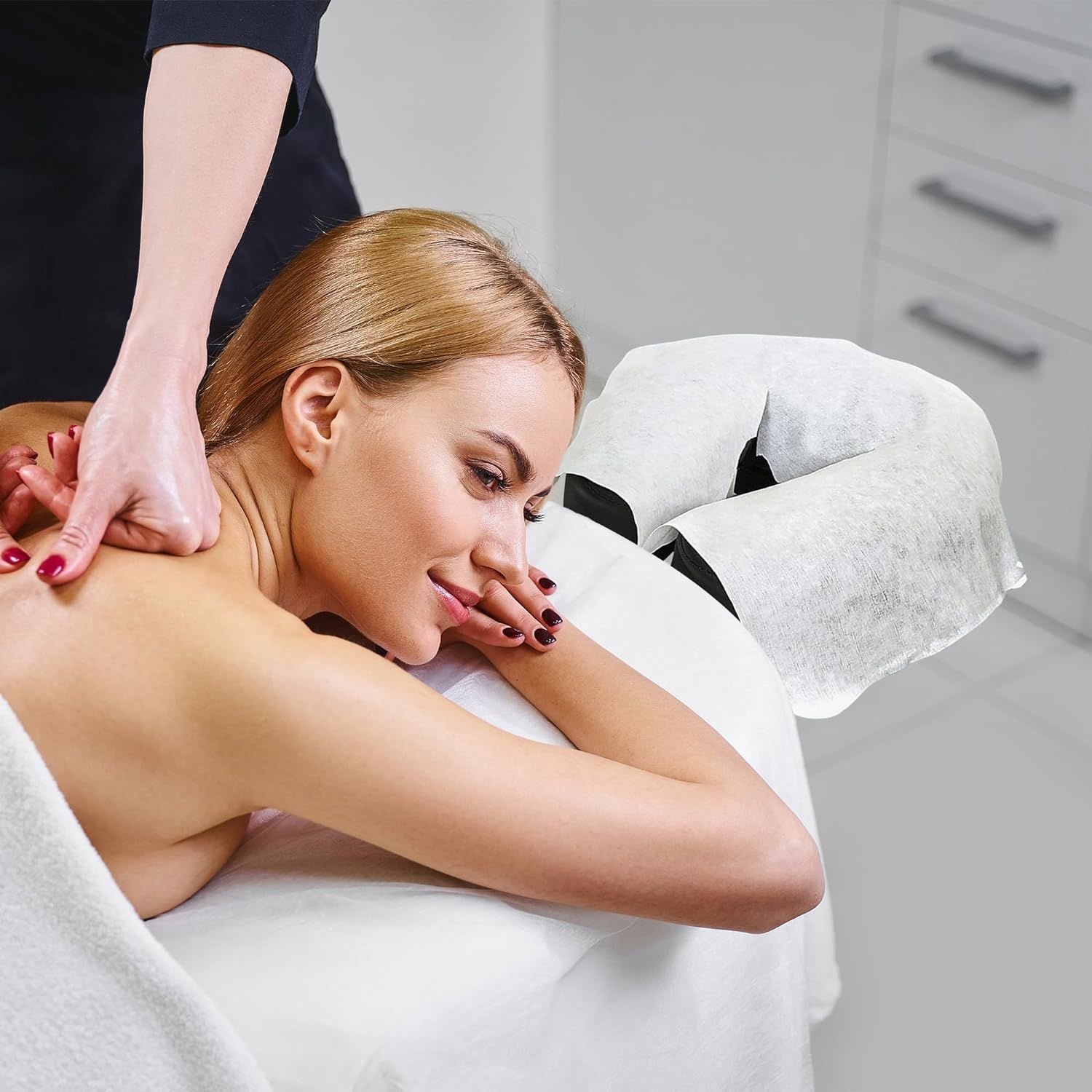 Home > Disposable Face Cradle Covers for Massage Table 12 x 16 Inch. 100 Pack White Viscose & Polyester Massage Face Cradle Cover. Soft and Durable Massage T