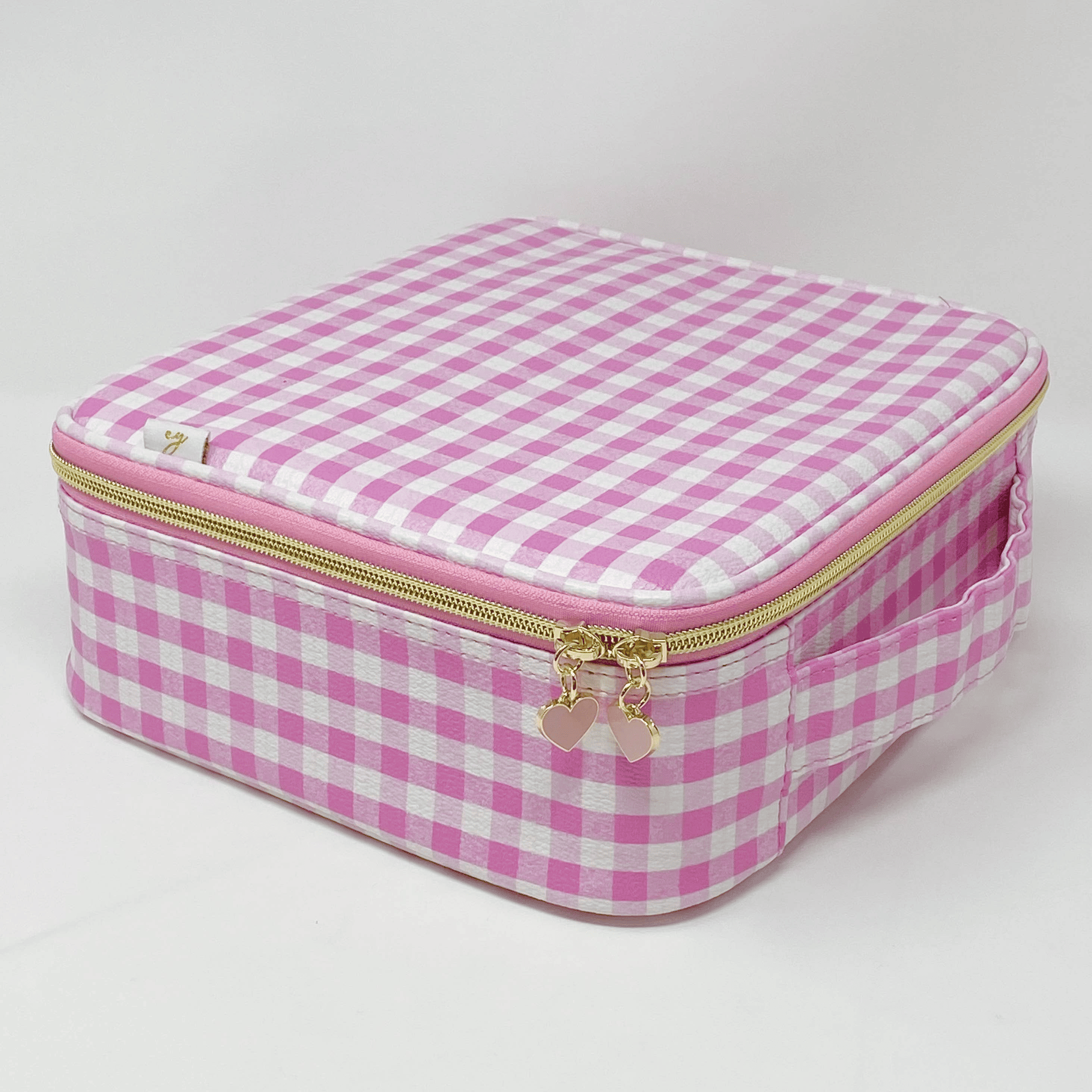 Pink Gingham one is custom printed on textured faux leather material and has pink heart zipper pulls!