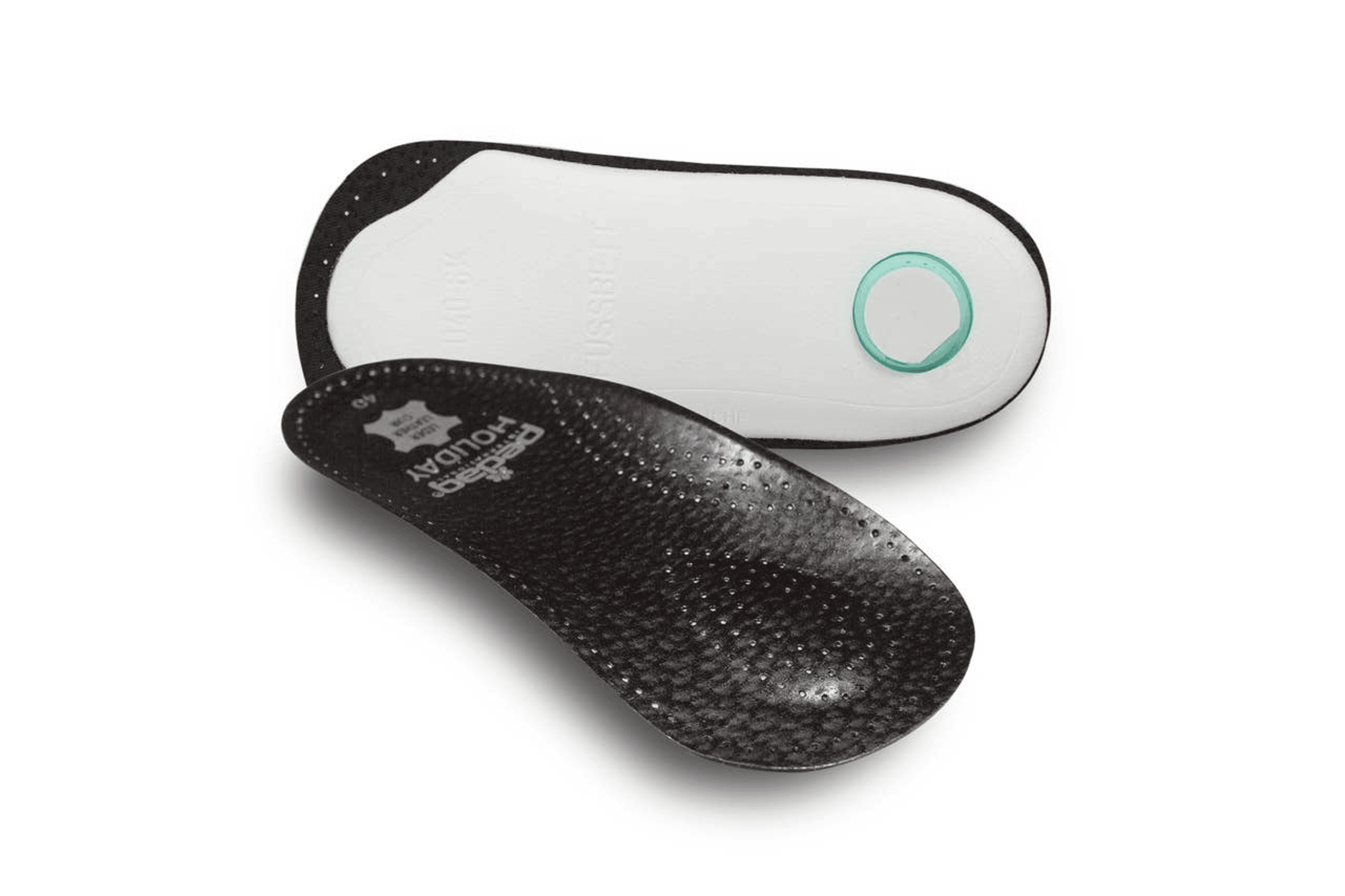 Pedag HOLIDAY BLACK is a 3/4 length leather insole, German hand-made orthotic suitable for almost every shoe. In everyday life, Pedag HOLIDAY BLACK is useful when standing on hard surfaces for long periods because it both cushions and supports the entire foot, thin enough to fit in almost any shoe. Pedag HOLIDAY BLACK has an anatomically shaped, semi-rigid foot bed with diagonal bridge function that stabilizes, aligns, and supports the mid-foot. The small, but effective metatarsal pad lifts and cushions the front of a foot. Awarded the American Podiatric Medical Association (APMA) Seal of Acceptance for promoting foot health. After wearing: please air overnight.