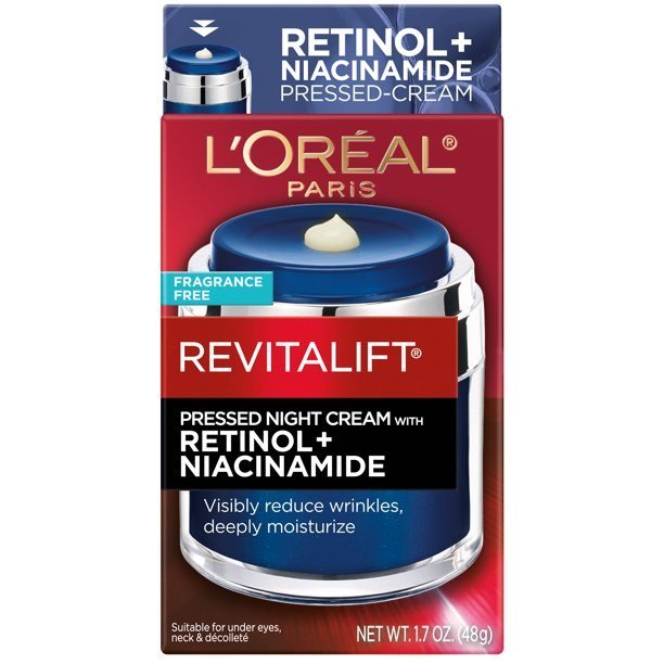 L'Oreal Paris Revitalift Pressed Night Cream with Retinol and Niacinamide; Retinol; niacinamide; and a complex of soothing ingredients are freshly pressed into a deeply hydrating yet lightweight night cream. Dermatologist tested for safety. Suitable for face; under eyes; neck; and decollete. How it works: Our new formula includes retinol [Vitamin A]; a top dermatologist-recommended anti-aging ingredient known to fight key signs of aging such as wrinkles and uneven skin texture.