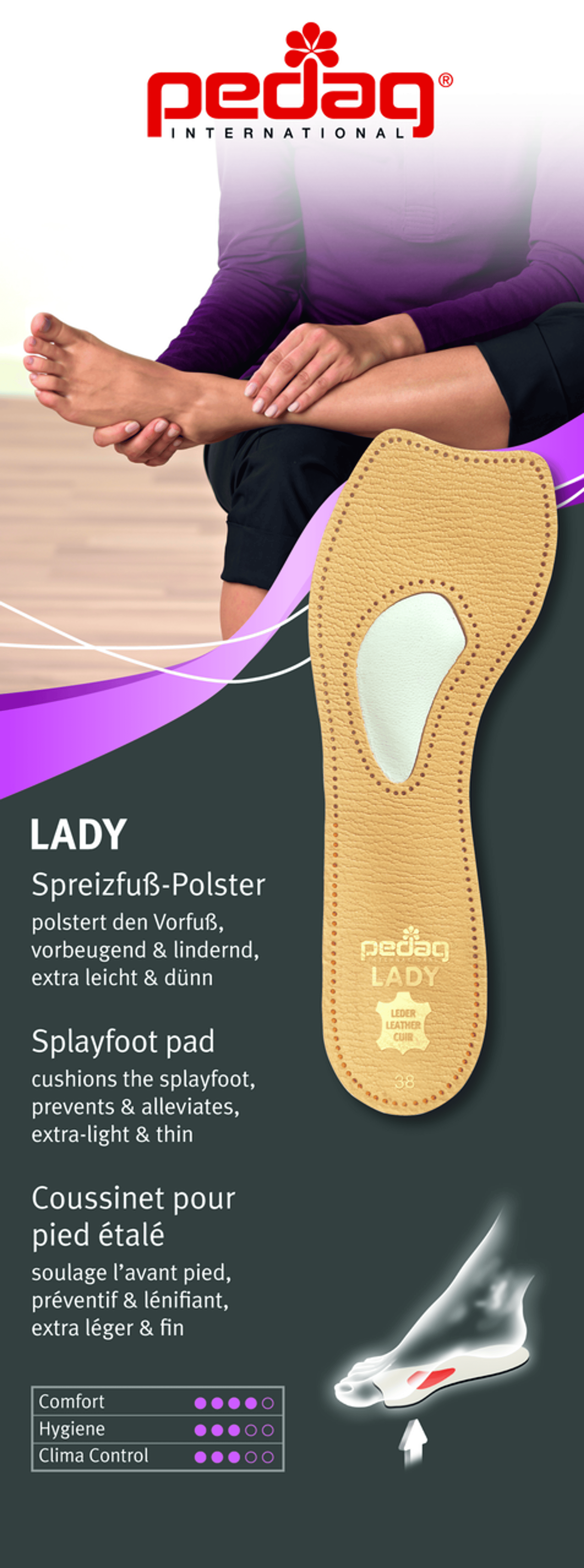 Pedag LADY is a 3/4 length insole with metatarsal pad that helps prevent forefoot pain. Ultra thin, ideal for all heel heights, and made from vegetable tanned genuine leather. Hand made in Germany from natural materials.