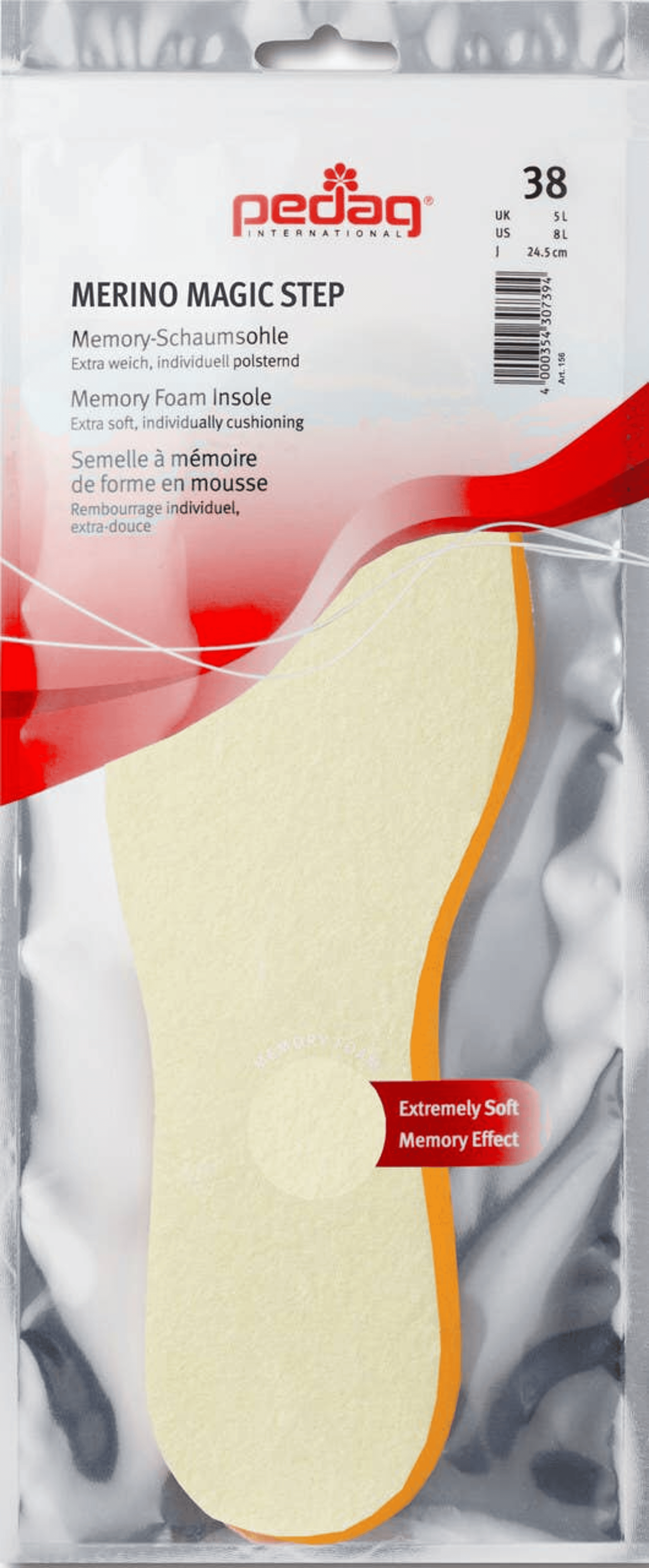 Pedag MERINO MAGIC STEP is a warm and cozy merino wool insole with Memory Foam that individually adapts to your feet. The foam absorbs the impact shocks of your steps and relieves your feet protecting your back and joints. The surface of the Memory Foam insole is made of pure merino wool. It guarantees heavenly warm feet and is incredibly comfortable to wear. Made in Germany.