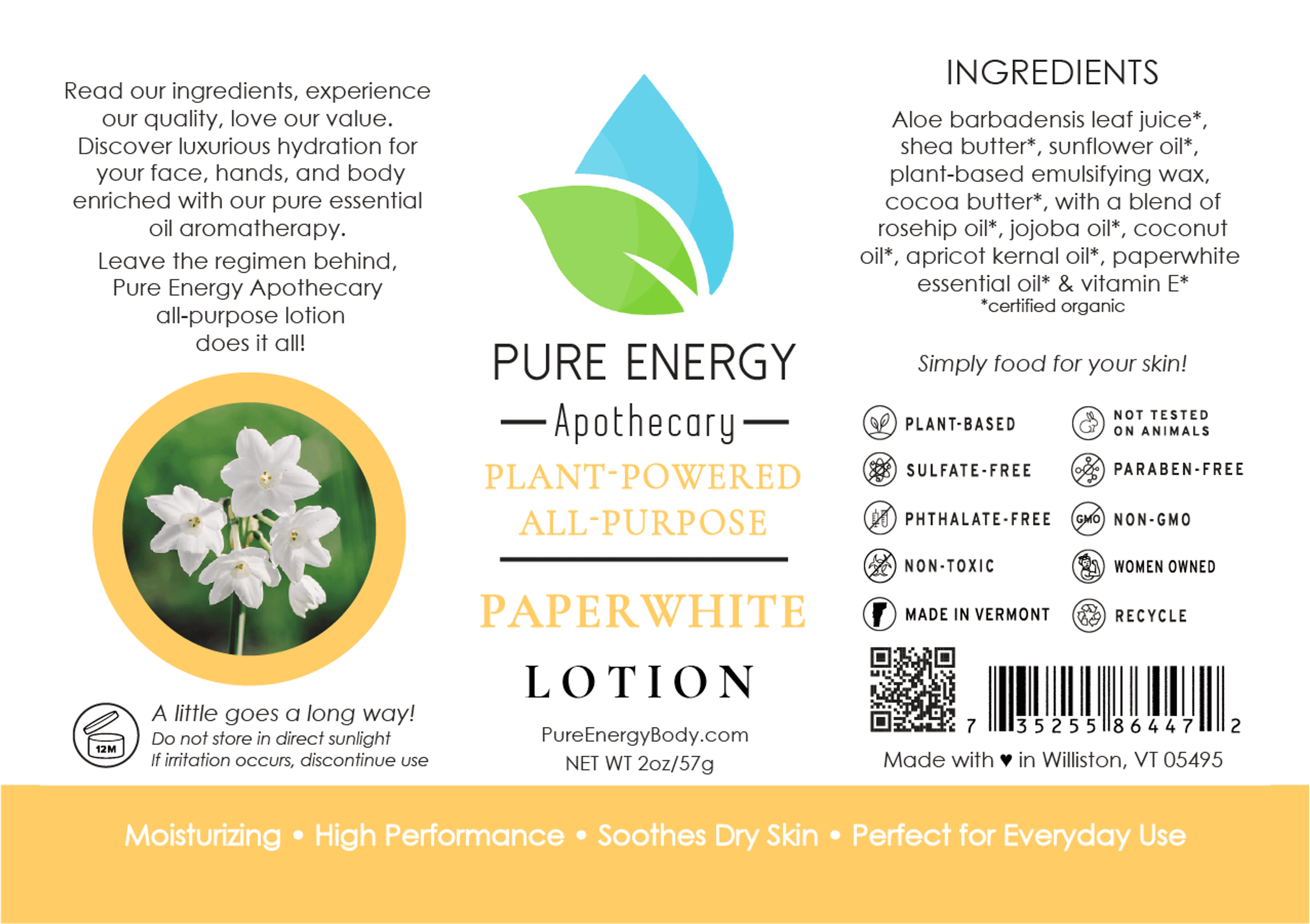 Aloe barbadensis leaf juice*, shea butter*, sunflower oil*, plant-based emulsifying wax, cocoa butter*, with a proprietary blend of paperwhite essential oil*, rosehip oil*, jojoba oil*, coconut oil*, apricot kernel oil*, and vitamin E*