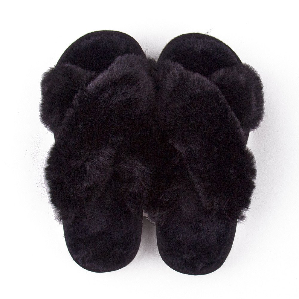 Stay comfy in this updated classic. The crisscross bands of plush; luxurious; fully lined faux fur will cradle your toes in comfort. The slip-on design will have you on your way in style and the flexible; anti-skid sole will ease your step as you go!