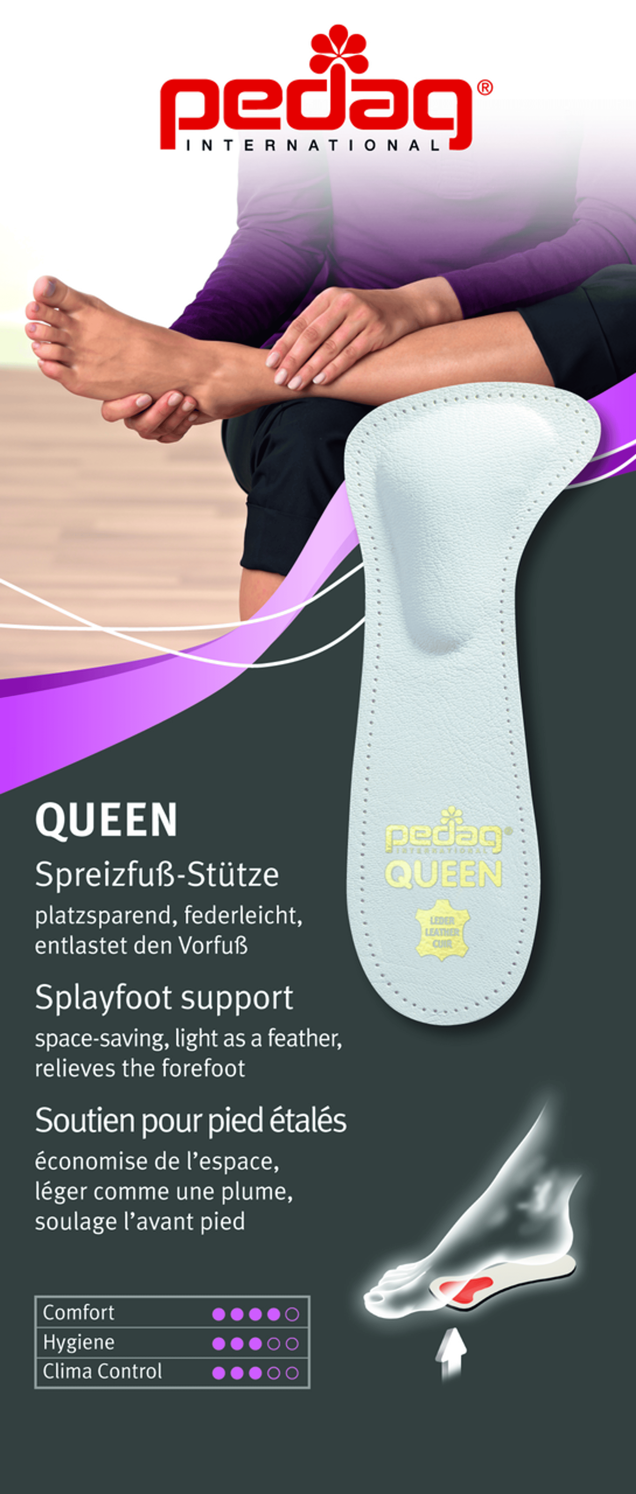 Pedag QUEEN is a 3/4 insole made of fine leather that provides support for splayed feet. It is extra-slim and thin to fit even into fashionable and elegant shoes. The metatarsal pad of Pedag QUEEN keeps the metatarsal bones in their anatomical correct position by slightly lifting them. Pedag QUEEN will help you enjoy walking again in tight-fitting shoes.