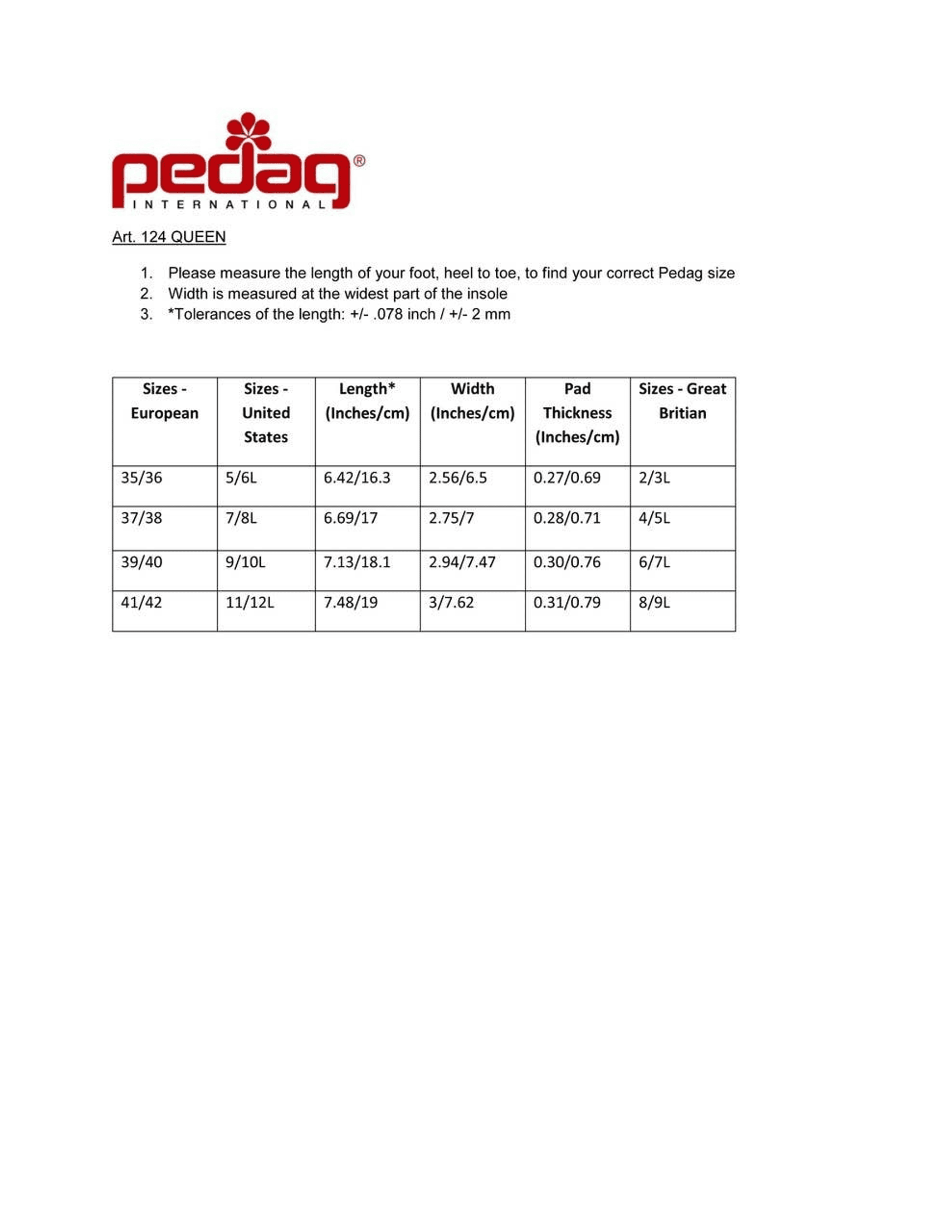 Pedag QUEEN is a 3/4 insole made of fine leather that provides support for splayed feet. It is extra-slim and thin to fit even into fashionable and elegant shoes. The metatarsal pad of Pedag QUEEN keeps the metatarsal bones in their anatomical correct position by slightly lifting them. Pedag QUEEN will help you enjoy walking again in tight-fitting shoes.