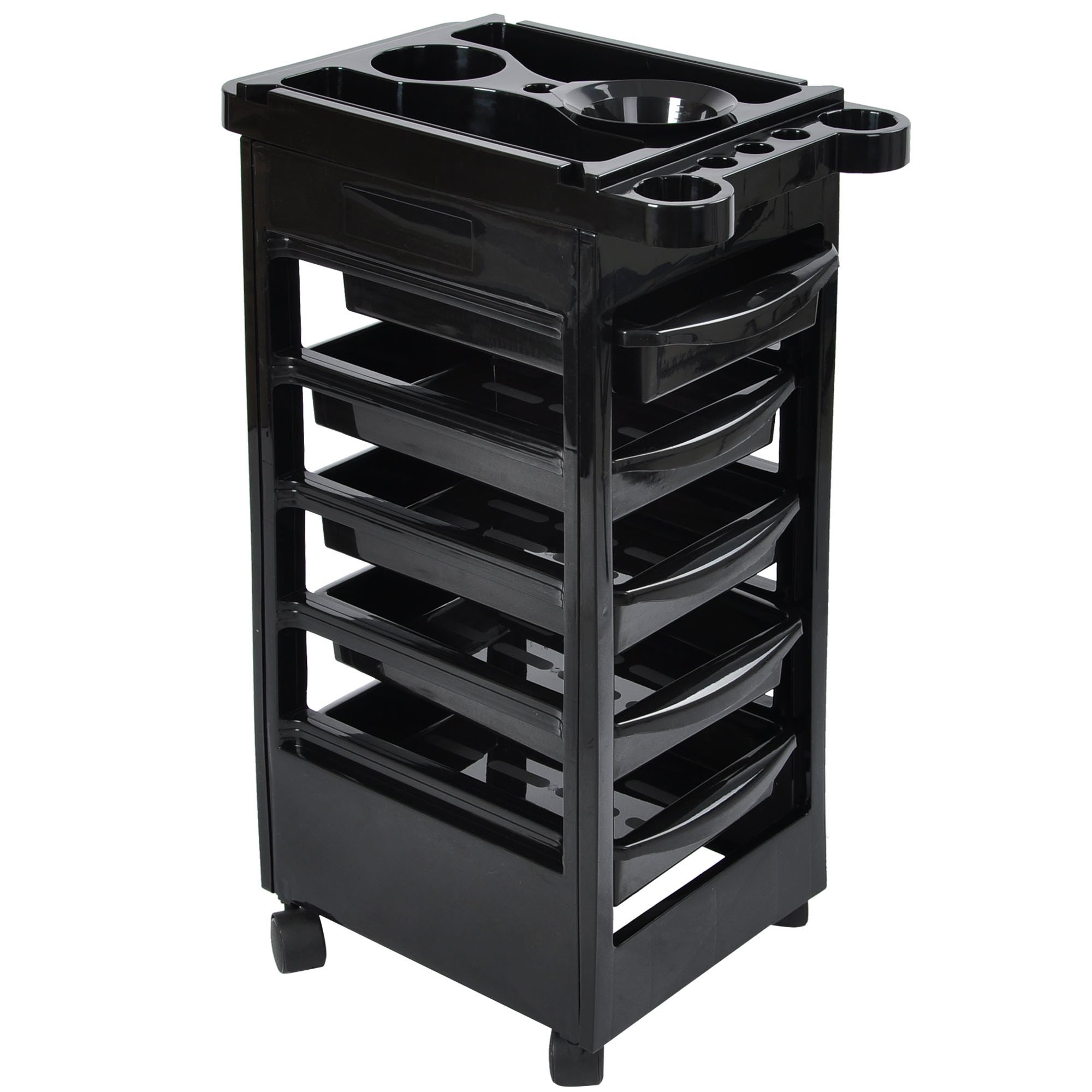 - Top Working Area - Features 2 large compartments for extra storage to place combs or other frequently used items; With 2 bowl slots for holding tint bowls, avoiding knocking over; Several holders for holding hairdryer, hair curler or hair straightener; Designed with 2 grooves allows to insert drawers on 2 sides for handy tools use
