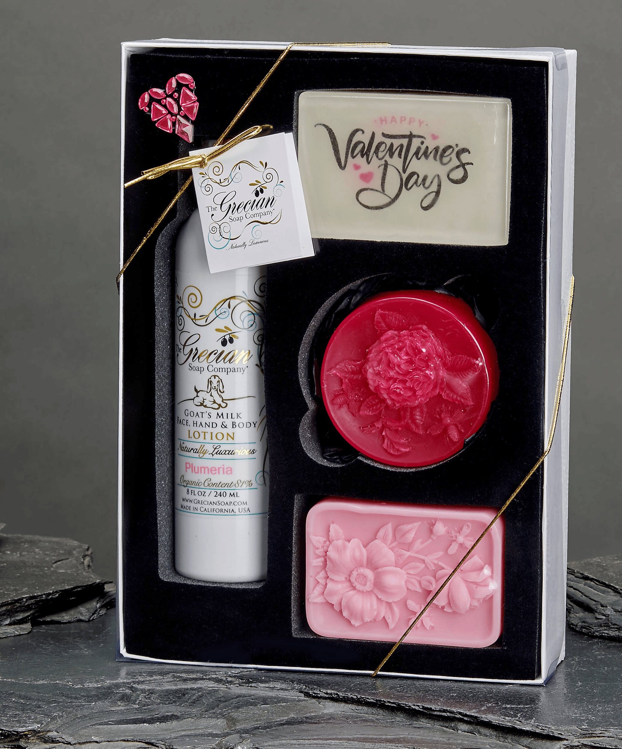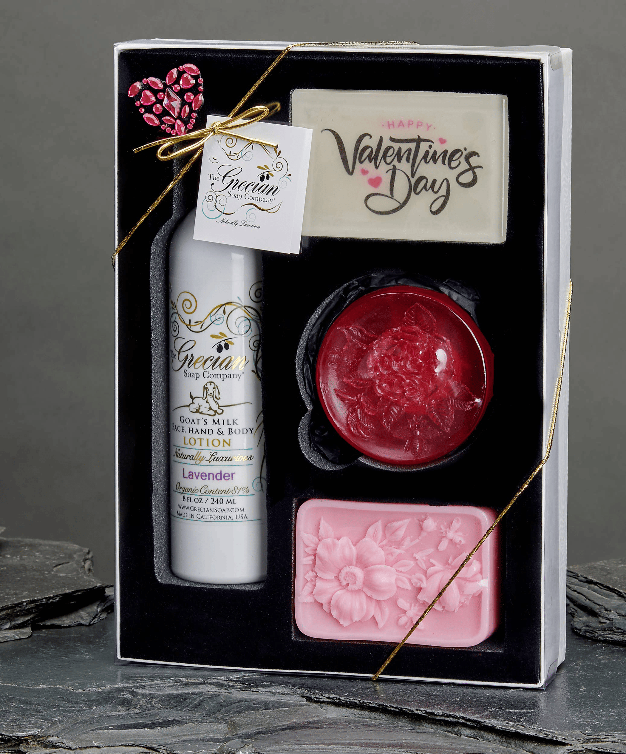 NEW! Made especially for Valentine's Day. Our LSVC gift sets include an 8oz. organic goats milk lotion, 2 specialty 6oz. soaps and an 8oz. soy candle, Available in 3 great fragrances, Lavender, Almond and Plumeria. All included items have the same scent. The Happy Valentine's Day message totally dissolves when water penetrates the clear soap over layer!????????????????